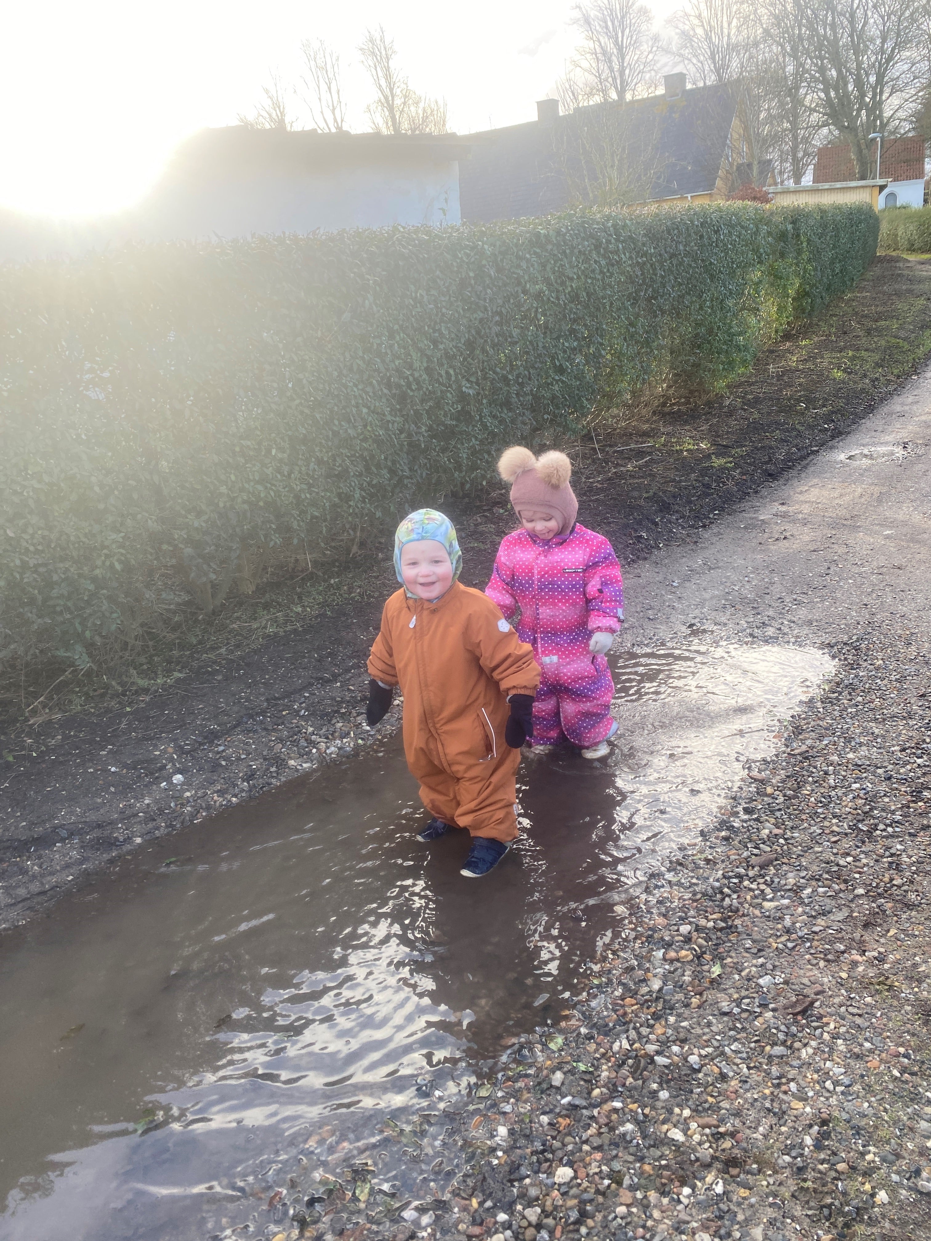 Vi leger med vand, hopper i vandpytter, mærker vand i spand, nedløbsrør, pytter